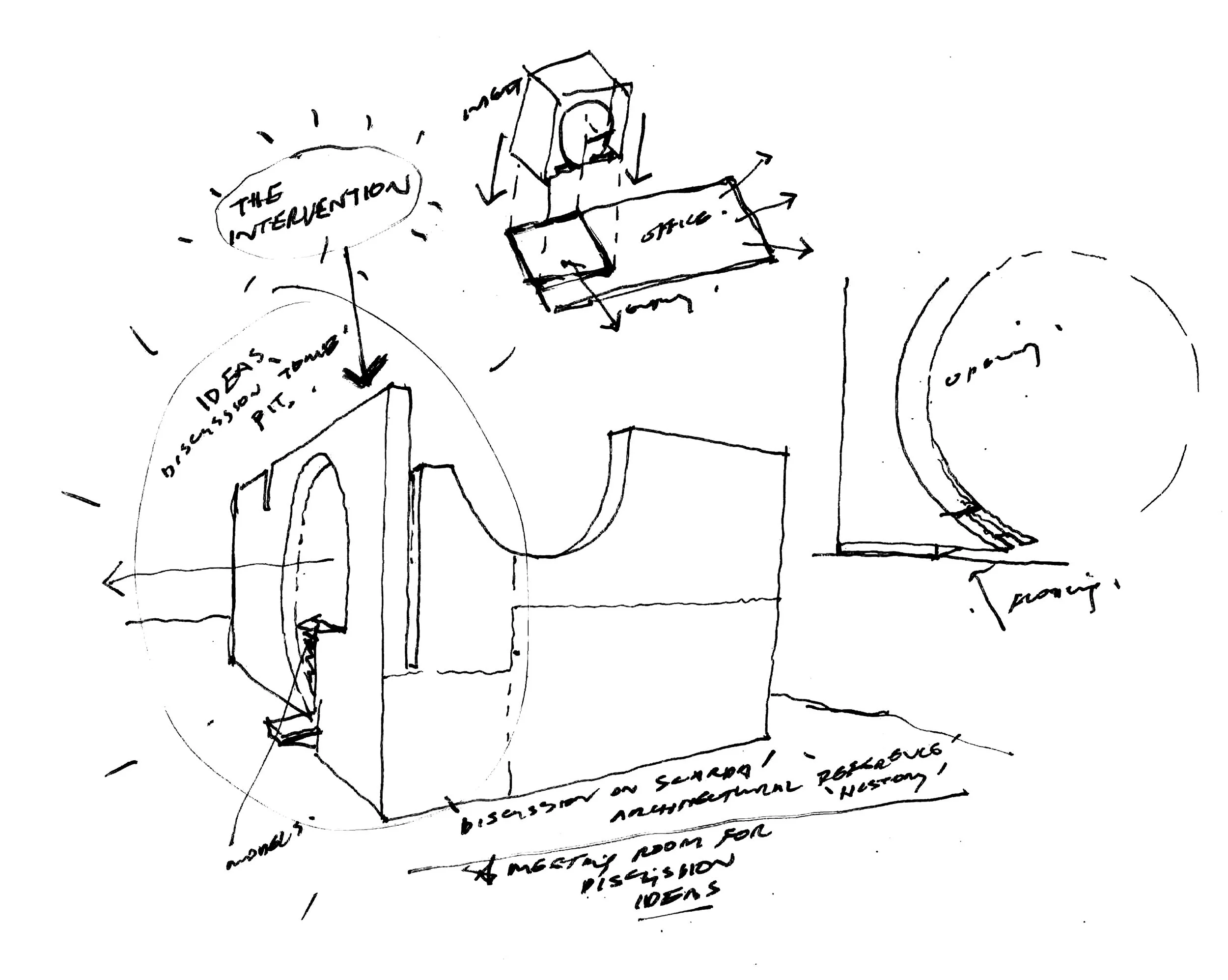 The meeting room or ‘Chapel of ideas’ externally clad in textured, natural steel sheet and internally treated in black stained plywood, is an intervention inserted into the space to create discussion into architectural history through the use of reference. Specifically derived from the chapel within Carlo Scarpa`s Brion Tomb of 1969-1977 in San Vito d`Altivole near Treviso, Italy. The meeting room is a window into the rich history of architecture, which we regularly find ourselves immersing in and as a result our ideas through discussions with our clients & collaborators.